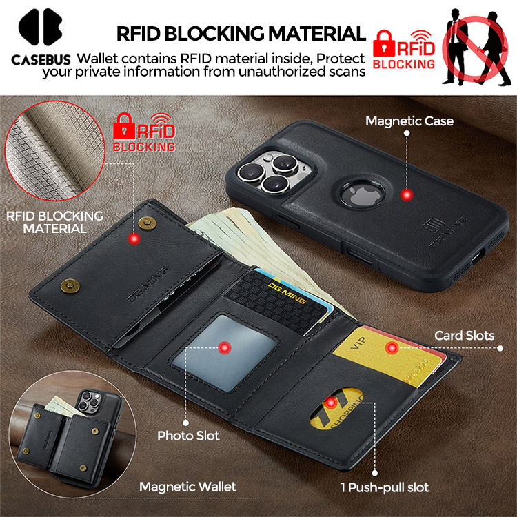 [Detachable Magnetic Card Holder] With strong magnetism the phone case and card holder adhere to each other and are detachable. The design provides 6 card slots + 2 side pockets + 1 large bill page, Using RFID Blocking materials and preventing unauthorized scanners from protecting your card information.