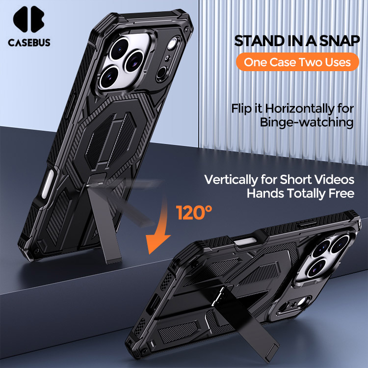 [Built-in Kickstand] The case features a built-in stand crafted from zinc alloy, delivering durability and stability. It easily switches between vertical and horizontal viewing angles to free your hands while video calling or binge-watching.