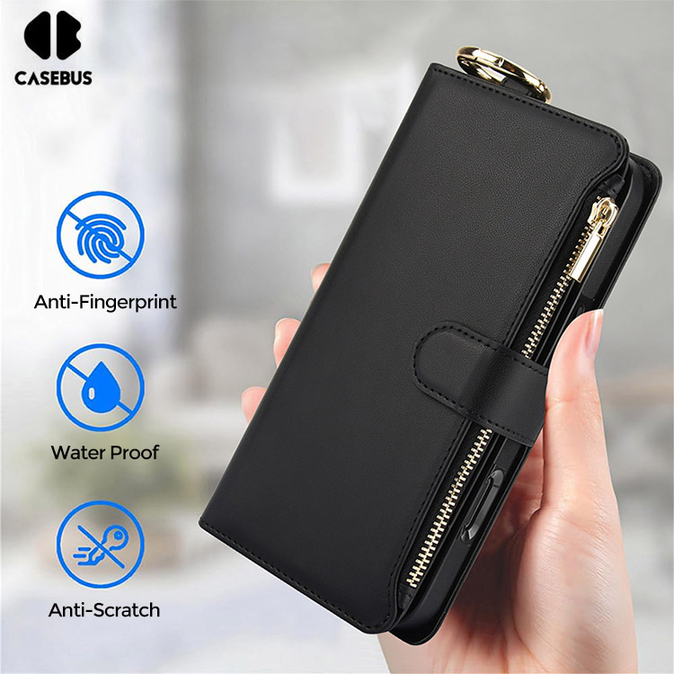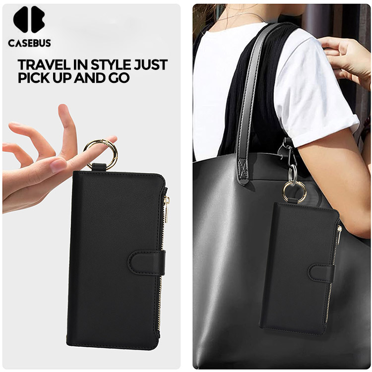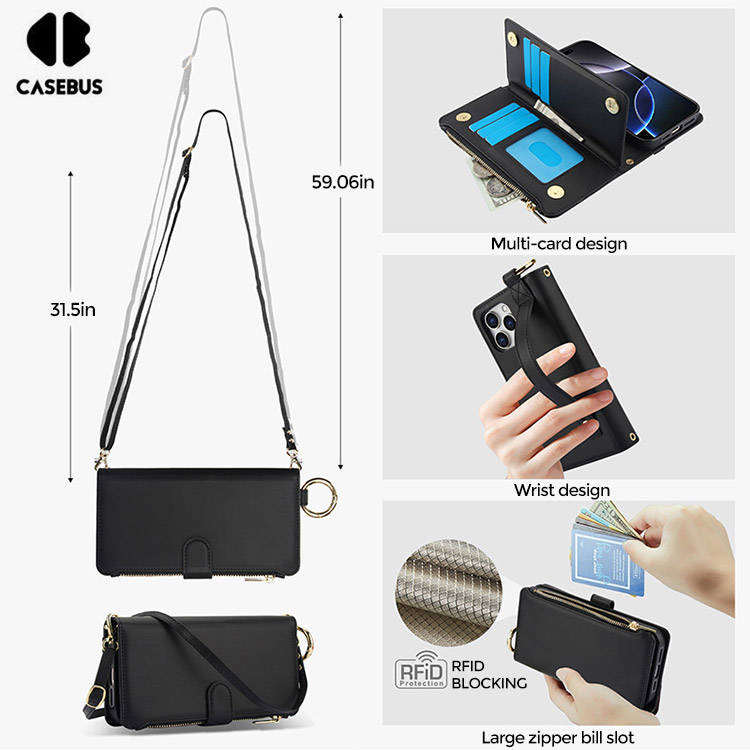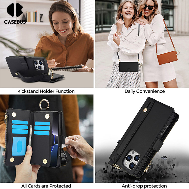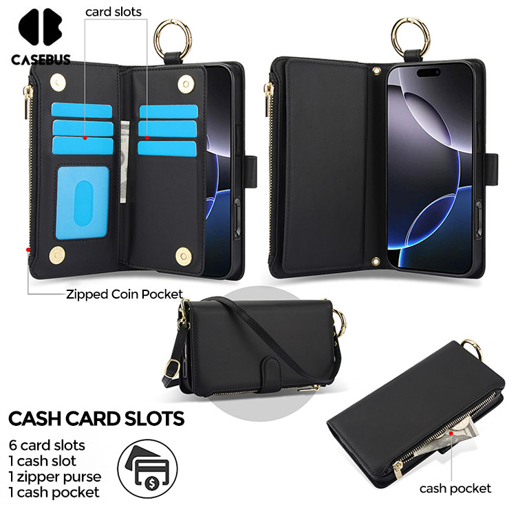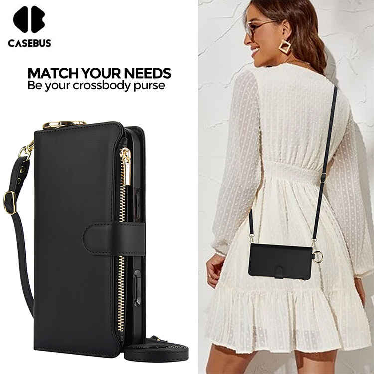 Casebus Classic Crossbody Wallet Phone Case, Premium Leather, Credit Card Holder, Zipper Pocket Purse Handbag, Kickstand Shockproof Case