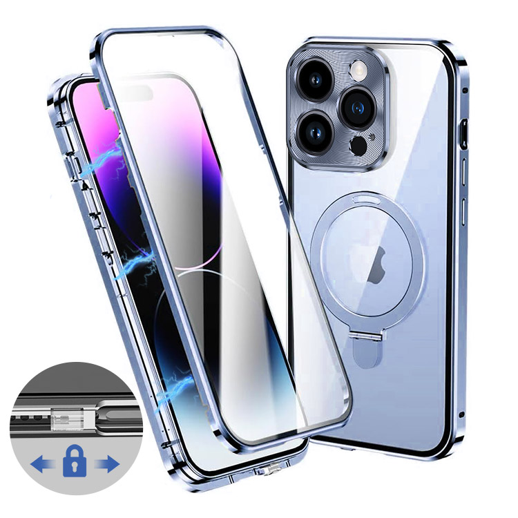 ADRIC Casebus Safety Lock Phone Case Compatible with MagSafe, Metal Bracket Magnetic Aluminum Bumper, Double Sided Tempered Glass & PC Camera Lens Protection, Kickstand Cover