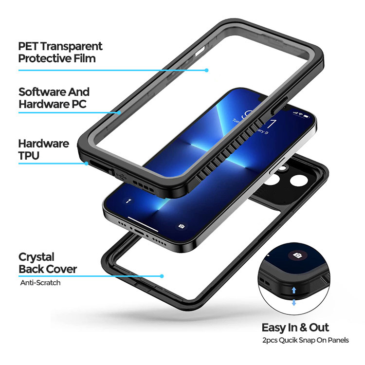 [IP68 Waterproof] After around 1000 tests, no leakage or water damage during 2 hours 6.6ft deep underwater. The transparent front and back camera lens covers enable high-quality, high-definition photos and videos even underwater. Perfect for water sports and daily use.