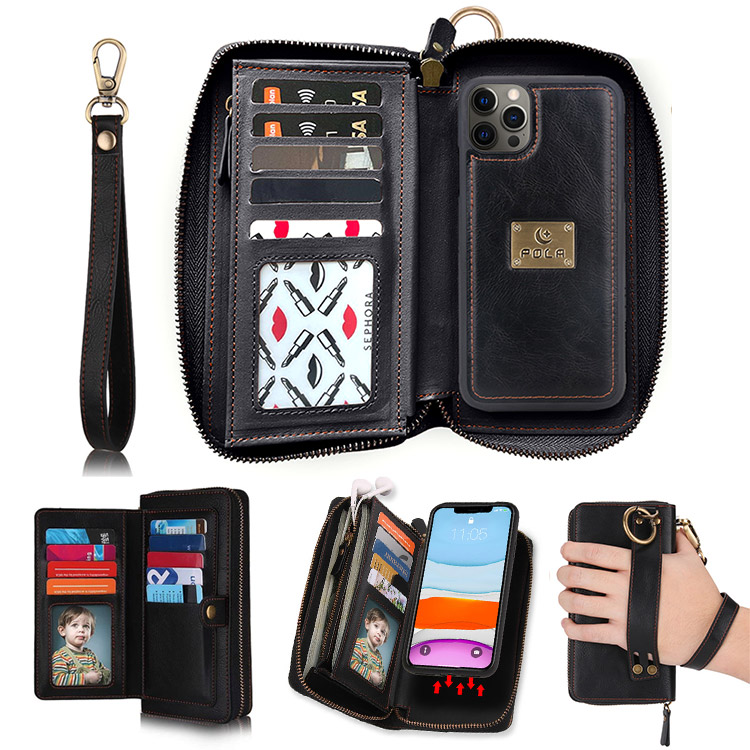 Casebus Classic Detachable Magnetic Wallet Phone Case, 11 Card Slots, 2 in 1, Leather Zipper, Folio Flip, Money Pocket Clutch Case